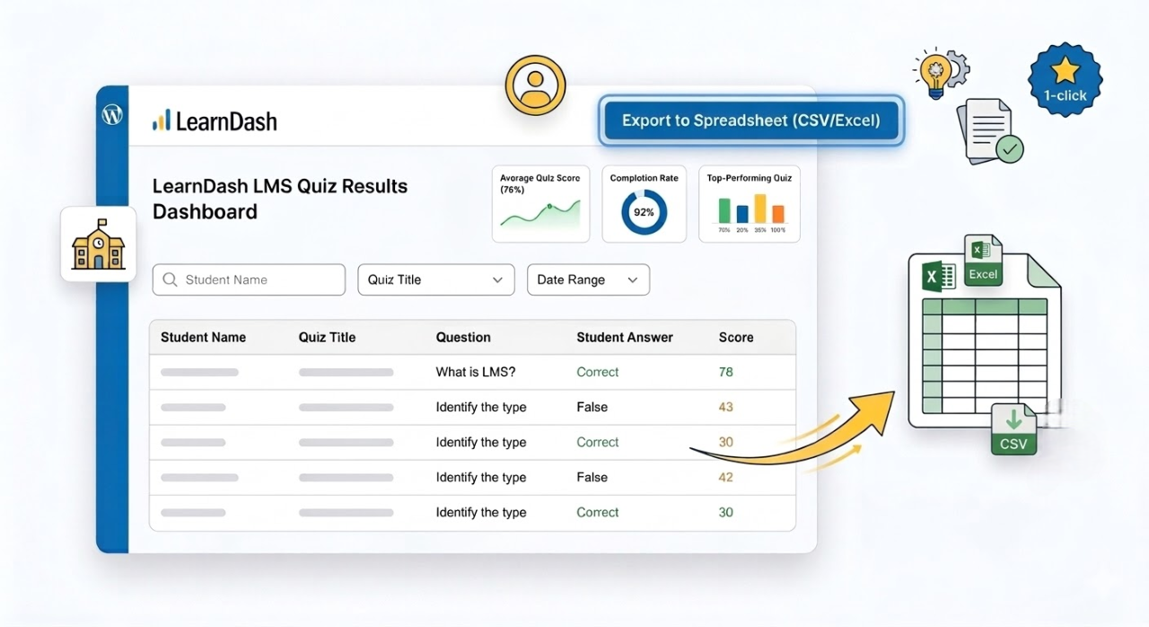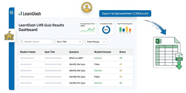 Export user-submitted LearnDash quiz answers instantly in a downloadable spreadsheet. Simplify reporting, track student progress, and analyze results with ease in WordPress.