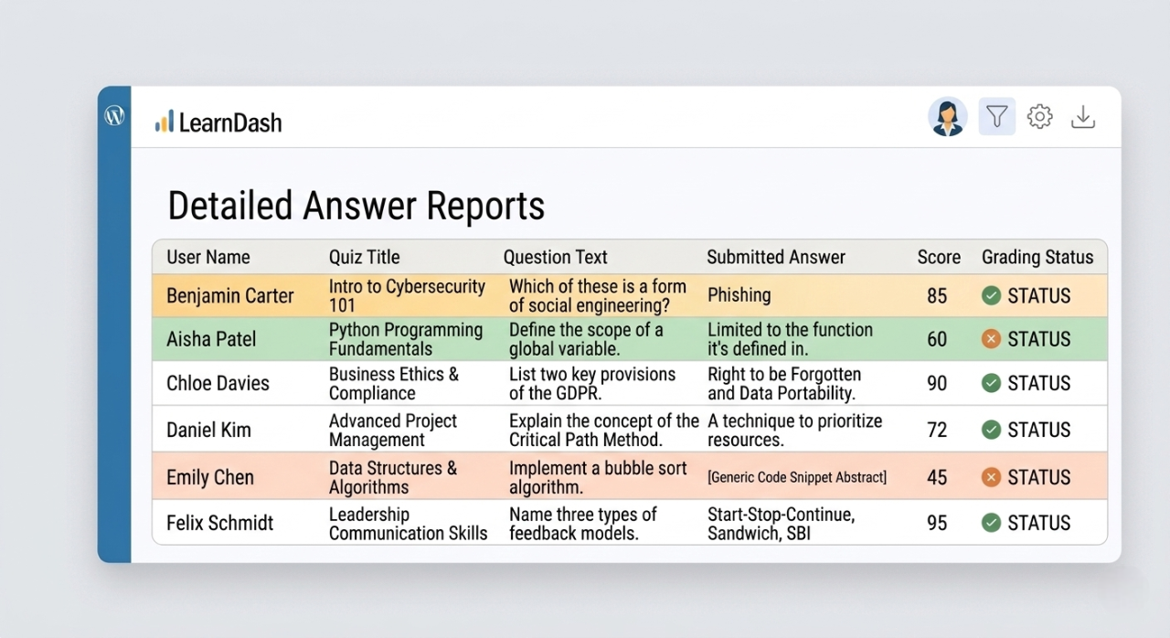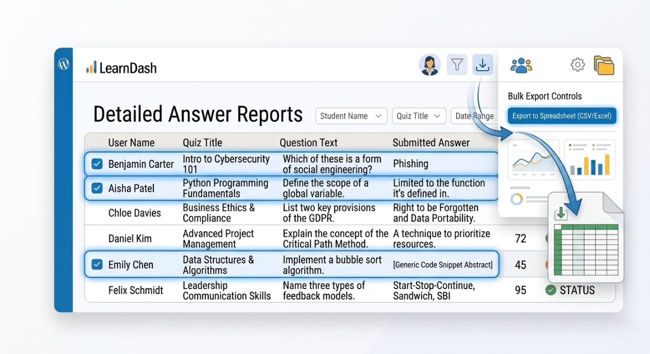 Download all user-submitted answers from LearnDash quizzes in CSV or Excel format with one click.