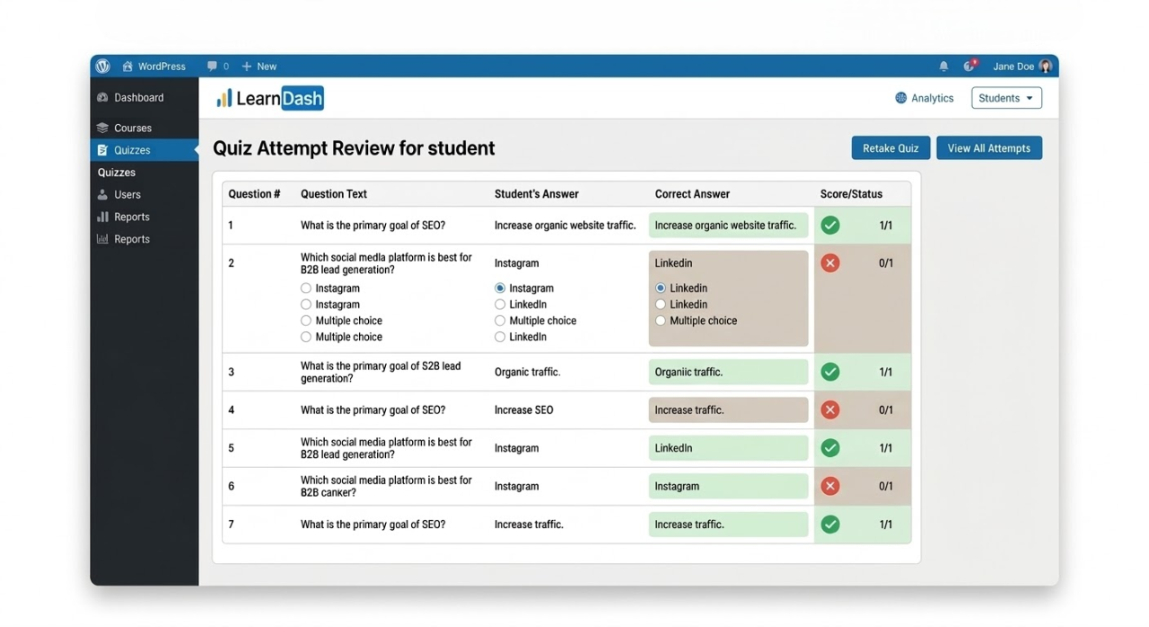 LearnDash Quiz Attempts is a powerful WordPress LMS plugin add-on that simplifies quiz management and student progress monitoring. Unlike standard LearnDash, it lets admins view all attempts for a specific quiz in one place, including every question and submitted answer, making course tracking faster and more efficient.