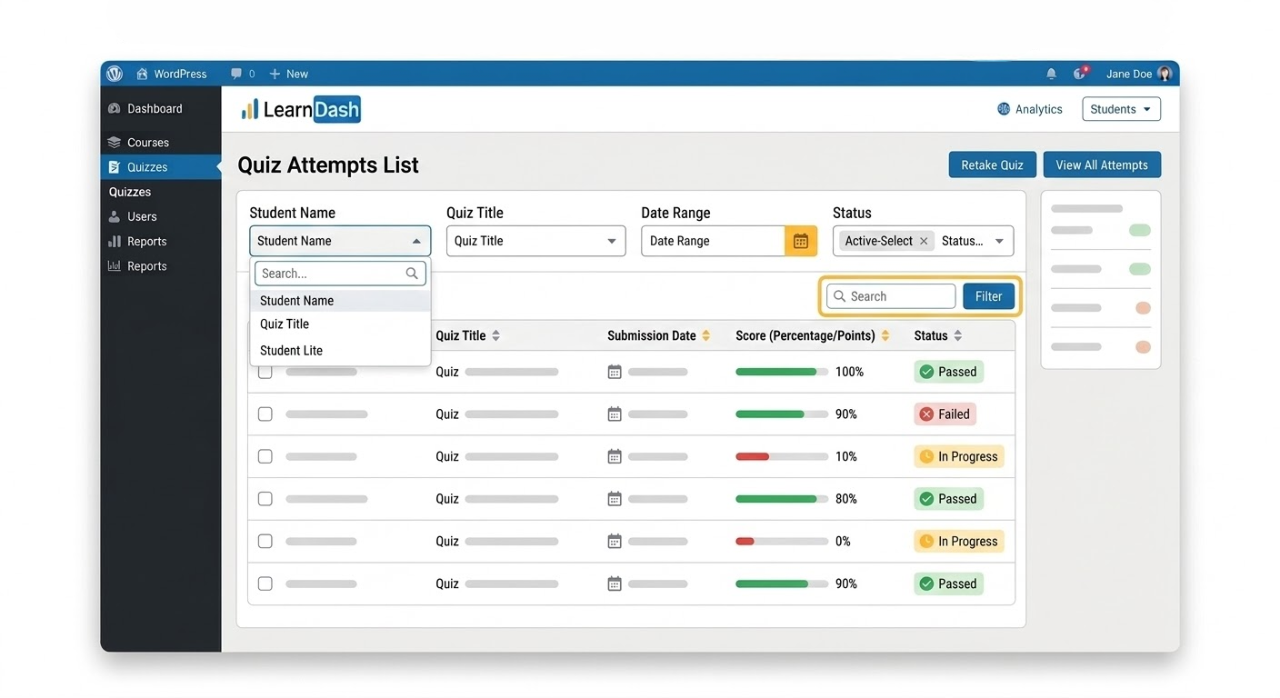 WordPress expertsView all LearnDash quiz attempts in a clean, dynamic table directly inside your WordPress dashboard.