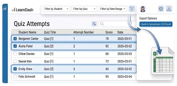 Track, filter, and review all LearnDash Quiz Attempts with ease right inside WordPress. Take control of your quizzes like never before.